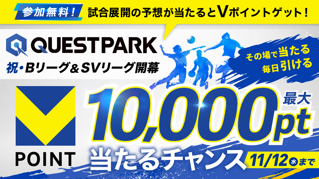 バスケとバレーのリーグ開幕&「QUESTPARK」参加クラブ追加を記念して、Vポイントが最大1万ポイント当たるくじを開催中!